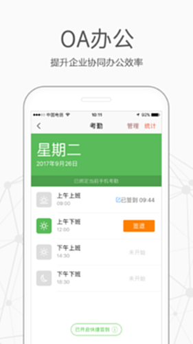 - 移动OA:手机考勤、流程审批、工作汇报、移动报销、任务管理、企业云盘、企业通讯录、在线聊天等丰富的功能