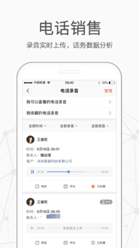 - 电话销售管理:PC端一键拨号、电话录音、电话数据统计、电话排行榜、客户跟进计划,让CRM与电话机完美结合,帮助企业掌握员工通话数据,优化沟通话术,提升销售业绩