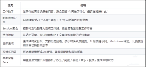 2、智能工作问答:软件支持自然语言提问,能自动识别时间范围并快速总结“今天做了什么”等工作内容。