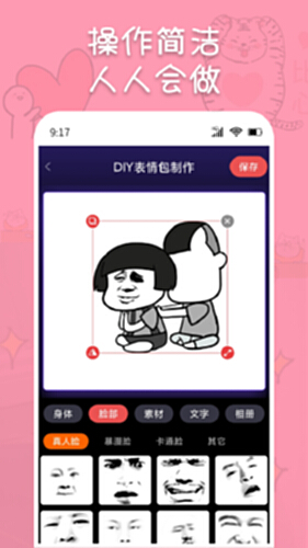 DIY表情包:包含大量身体素材、脸部素材、贴图素材等,可以自己制作不同的表情包。