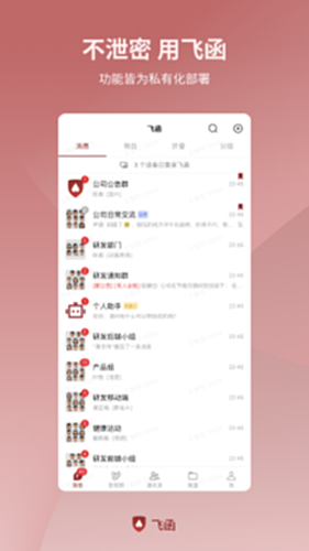 飞函,是安全稳定的私有化一站式办公平台,功能包括即时通讯、组织架构、音视频会议、网盘等,所有功能均为私有化版本,所有数据均存储在企业或组织内部,安全不外泄!飞函遵循简洁主流的产品设计,用户无需学习即可快速上手。