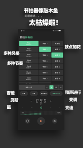 鼓机伴奏器是一款吉他练习工具,可以产生鼓点节奏、和弦、贝斯。如果你在学习吉他的过程中,厌倦了乏味的节拍器、或者想体验多声部协作的乐趣,但却对价格高昂的实体鼓机望而却步。那么,这款鼓机伴奏器APP会是一个不错的选择。