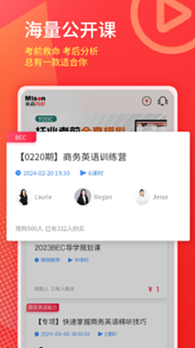 你想找的这里都有!甄选美森自研好课,高质量教师、丰富的课程,助你快速提升BEC、托业、日语水平,掌握考试技巧、备考方法,轻松达成BEC、托业等商务和职业能力英语、考级日语、兴趣日语的学习目标!