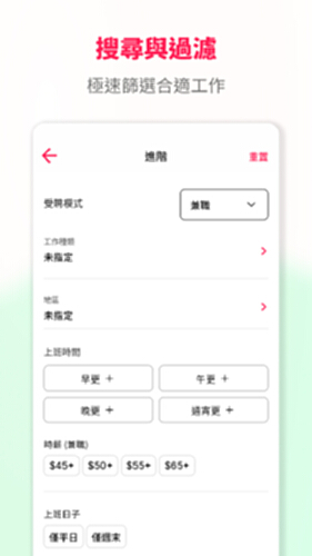 1. 备有全职full-time、兼职part-time及临时工/合约工/短期工作搜寻,按行业、 工作地区、时间及薪金范围进行筛选。