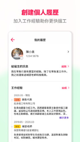 香港前线行业求职及招聘平台,涵盖16种行业范围,集齐全港唔同前线好工, 全职兼职任你拣,帮助大家寻找下个工作可能! 简单使用指示及步骤,详尽显示 工作内容、返工地点、人工福利等资料; 只要上载履历、设定空缺通知,即可随 时申请心水好工,更有系统帮助配对工作,1日内收到雇主回覆 *# ,方便又快捷!