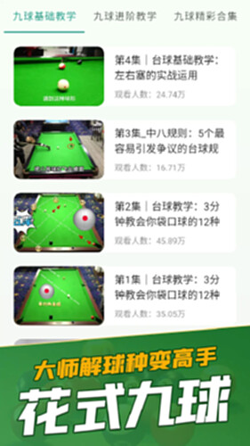 丰富的教学内容 :涵盖从台球基础知识,如球杆的选择、台球规则讲解,到高级技巧,如精确的击球控制、复杂的球路规划。通过高清视频教程和详细的图文解析,让您仿佛置身于专业的台球训练课堂。