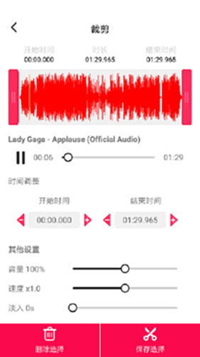 音频剪辑:从本地音乐库导入音频,自定义剪切范围,对指定的音频区域进行编辑和制作。
