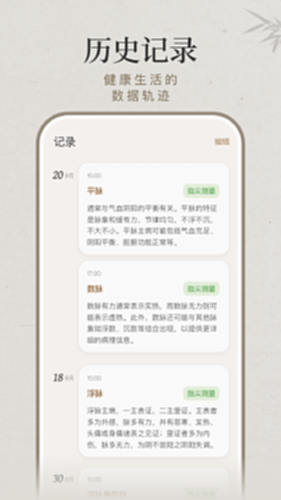 4.历史记录:记录您每次把脉的记录,方便您随时随地查看,随时随地分享。