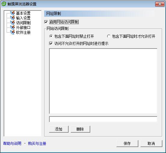 8.限制浏览功能。可以限制只允许访问指定的几个网站。也可以禁止访问指定的页面。对于一些有功能限制的需求非常方便。直接设置单位网站做触摸屏查询应用的单位可以限制访问的具体网站域名。