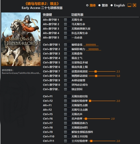 1、自定义游戏参数:骑马与砍杀2修改器允许玩家自由调整游戏中的各种参数,如战斗速度、伤害倍率、角色属性等,打造个性化的游戏体验。